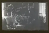"Gluggen, Axels moster Sofia Karlsson 80 år." Porträtt av en kvinna som sitter vid ett bord med gratulations-blommor.