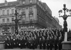 Bilden föreställer tre sjömän med blombuketter i handen.