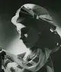 Porträtt av kvinna, möjligen modellen Hjördis Grundel-Starenius, i hatt med flor och rosett i randig textil, samt örhängen och flerradigt pärlhalsband. Från Jeanette Colombier.