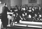 Skara Manskör. Vänortsbesök från Norge 6 juni 1959. Körens ordförande Allan Cederborg hälsar gästerna välkomna till Skara på Läroverkets skolgård och kören välkomstsjunger under ledning av Ivar Bergström.
