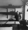 Ritkontoret vid Oskarshamns mekaniska verkstad. Gamla ritkontoret. T.v ritbiträdet Edvin Magnusson,sen. Magner, i mitten skeppskonstruktören Gustaf Skeppsstedt- (slutade 1919/20), t.h. maskinritaren Axel Åberg. "Giöbel och Skeppstedt hade hand om avdelningen. När det var bråttom satt far (Skeppstedt) hela nätterna hemma och ritade i lampljus".