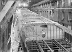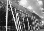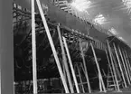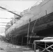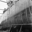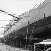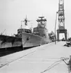 Norska jagaren Arendals (D310) styrbordssida. Uppe på däck står besättningsmän på rad. Från Danska och Norska örlogsbesöken den 29/6 - 4/7 1951.