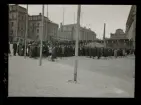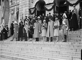 "Jubileumsfästligheterna glansfullt inledda" - kung Gustav V med följe på trappan till Universitetshuset, Uppsala september 1927