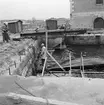 Sjösättning av minröjningsfartyg nr 4, Kullen, typ Landsort-klass. \\\\anm. neg ingår i en serie om 11 st varav endast det första \\V 100270 scannats/gp. En lyftkran sjösätter ett fartygsskrov.