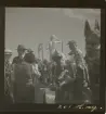 Folksamling framför liten scen på marknad/ nöjesfält. Tre personer på scen, en spelar dragspel. "Atlet-damen".