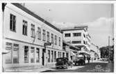Västra Trädgårdsgatan söderut. En av entréerna till modevaruhuset Sidenhuset t.h. Reklamskylt för Blanche Teatern hänger över gatan.