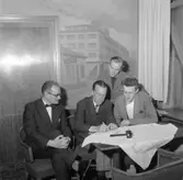 "Aktiv ungdom på Havet Augusti 1957". Bakom männen i restaurang Havet syns en väggmålning av konstnären Pelle (Per Axel) Åberg (1909 - 1964), Stockholm. Motivet föreställer bl.a. Bohusläningens hus i Uddevalla.