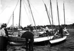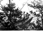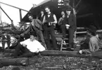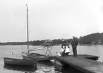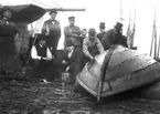 Sällskap på bryggan. Från vänster: Carolina Carlsson (mor till Karl Fredrik), Ebba Wislander (syster till Karl Fredrik) , pojken Idus Carlsson (son till Knut Carlsson), Adele Lundberg (hushållerska hos Carolina Carlsson), Ingeborg Häggblom (syster till Karl Fredrik), flickan Astrid Häggblom, Häggblom (journalist Stockholms Dagblad), Ernst Carlsson (bror till Karl Fredrik) samt Karl Fredrik Carlsson.