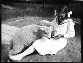 Pigorna Beda Lundgren och Agnes Andersson klipper fåren i Nils-Nils. Foto 1917-1918.