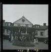 En större grupp med män, kvinnor och enstaka barn, står och sitter på gräsplan på gården till Brahegatan 40. En putsad byggnad med ett öppet fönster och öppen dörr. Till höger en uthusbyggnad i två våningar med locklistpanel, möjligen rödfärgad.