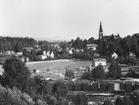 Fotografi av ett lummigt Gränna mot kyrkan i fonden. Bilden sannolikt tagen från balkongen mot väster på Brahegatan 39.