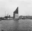 Pansarkanonbåt (HM Björn) till ankars vid brygga i hamnen i Karlskrona 1914.