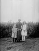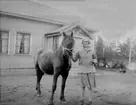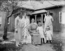 En kvinna, syster till fotografen, i rutig klänning och hatt poserar i trädgården på Rultane, Hedekas, vid en blomrabatt med bland annat rudbeckia (gullboll), åbrodd och till höger en buske av något slag.