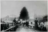 Samer och arbetare framför förrådsbyggnaden vid Rensjön. Byggnadsingenjör Höijer synes luta mot björken och doktor Skanthe står 2 man till höger om honom. Björn som passerat järnvägsbanken ligger skjuten dem.