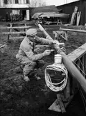 Medlemmar i Ekolns Segelklubb vid deras första lottbåt, sjösatt i Fyrisån, Uppsala den 15 juni 1923