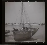 568 F. Stieg Trenter, Torremolinos. Män vittjar fiskenät från båt uppdragen på stranden.