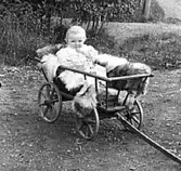 Pojke skjutsar spädbarn i vagn i Ambernath, Indien, 1933
