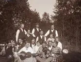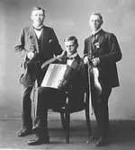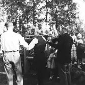 Republiken Käckåsens statskapell spelar, fr höger Erik Frykman, Olle Pallin, "Olle på Halla" Jonsson (skymd), Joel Hedåsen
