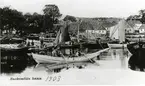 Skåne, Kristiansstads län, V Karups socken, Ramsjöstrand. Hamnen. Piren med lustbåtar och th en gammal däcksbåt med hejarställning för bottengarnspålar.