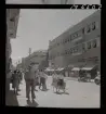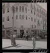 Varuhuset Nordiska Kompaniet, Hamngatan i Stockholm. På byggnadsställningar arbetar man med rivning av skyltfönstrens splitterskydd i samband med freden i maj 1945. Människor går in och ut eller passerar på trottoaren.