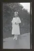 "Nanny Andersson, Mo gård." Porträtt av en kvinna som står vid ett bord fullt av gratulations-blommor.
