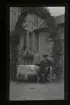 "Valfrid Larsson, kusk på Fogelstad." Porträtt av en man som står vid ett bord fullt av gratulations-blommor.