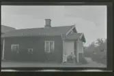 "Väsby Hilda o Hilmer Vahlström, Olle, Claes." En familj på trappen till sitt hus.