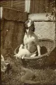 Knytkalaset 5 juli 1965. En jubileumsvärdinna och en liten flicka håller gemensamt i en korg. Den lilla flickan har också en kattunge i famnen. Andra barn och vuxna står runtomkring dem.