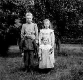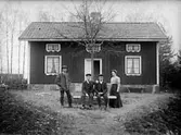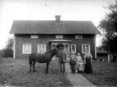 SLÄKTGRUPP SAMLAD I TRÄDGÅRDEN FRAMFÖR SITT BOSTADSHUS.