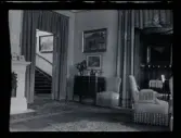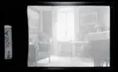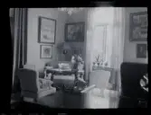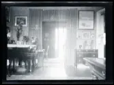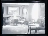 Interiör från Araby herrgård. Salong med sittgrupper. I mitten syns en kakelugn. I taket hänger en kristallkrona. ca. 1910