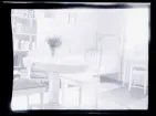 "Kloar-Eriks" stuga. Interiör från fotografens sängkammare, med säng, bord och stol.