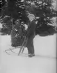 En bild från södra koloniträdgården, från vänster: hembiträdet Ester, Karin, Eva och Sören Brundin på sparkutfärd.
