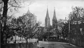 Vykort, "Halmstad, Västra Folkskolan." Sedd från skolgården. Skolbyggnaden ritades av dåvarande stadsarkitekten Sven Gratz (1864-1931) och invigdes 1908. På 1930-talet började skolan kallas för Brunnsåkerskolan, eftersom platsen den hade byggts på hade benämnts som Brunnsåkern, eller Olssonska lyckan.