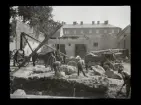 Två män kommer gåendes längs gata. Högar av tegelpannor och bråte på trottoaren.