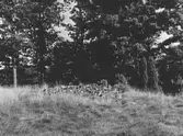 Utgrävning av rösebottnar på Östergårdens ägor, skärslev nedstucken mellan stenar i kantkedja.