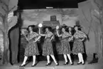 Scen ur revyn "PÅ KRYSS MED BEATA" år 1943 i I.O.G:T.-lokalen, Strömgatan, Kalmar. Från v.:1. Kerstin Karlsson 2. 3. 4. Stina Axelsson 5. Inga-Lisa Andersson 6. Lennart Gustafsson