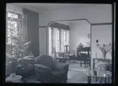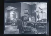 Interiör från Araby herrgård. Salong med sittgrupper. I mitten syns en kakelugn. I taket hänger en kristallkrona. ca. 1910