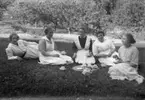 Rundeln framför Julita gård i Södermanland, före 1930. Utsikt över sjön Öljaren. Plantering med sommarblommor och agave.