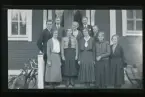 "Vid skolan Laggartorp." Grupporträtt, kvinnor och män uppställda på trappan till en byggnad.