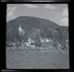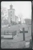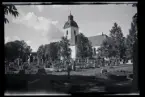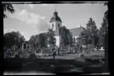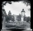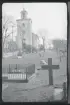 Vy över kyrkogård och vatten, fotograferat från kyrkans tak/ torn.