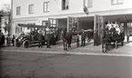 Större grupp män; vissa i branduniform. Fotgrafens ant: Brandkåren. Kull.