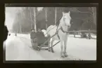 "Sofia, Alfred Eklund, Sofielund" En man och en kvinna i en släde dragen av en vit häst.