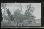 En man kör ett hölass på en kärra dragen av två hästar. "Erik Hellkvist i hölass, Fogelstad."