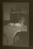 Ateljébild, spädbarn på en filt ett av fotograf Johnsons barn? Metallutfällning, gul missfärgning repor.