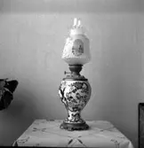 Bostadshus Roten M 11-12, okänt årtal. Ett rum med en tapetserad vägg, lampa, dörr och spegel.