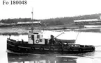 Bogserbåten FANNY passerar framför ubåtsdepåfartyget PATRICIA (A206).