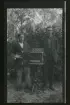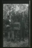 "Gunnar och Johan Karlsson." Porträtt av två unga män. Den ene håller en fiol, mellan dem står ett dragspel på ett litet pelarbord.