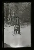 Vintermotiv, tre barn. Märta Lindskog på skidor, Margit skjutsar sin bror Karl Erik på spark. Fotograf Sam Lindskog