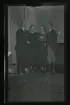 Två kvinnor och en man, troligen syskon. Kvinnorna bär storrutiga klänningar, den ena med stor rosett i halslinningen. Torsten Dahl från Fotskäl beställde bilden och kan vara deras far eller den unge mannen på bilden.