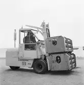 Truckförare med pappersbalar. Bilden ingår i serie från produktion och interiör på pappersindustrin Papyrus, 1980-tal.